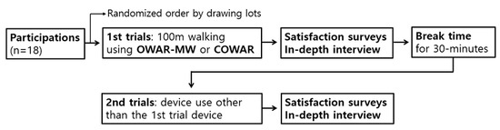 A usability test was conducted by comparing two robotic walking devices: a commercialized over-ground walking assistance robot (COWAR, Andago) and the newly developed OWAR-MW. The procedure of the usability test is illustrated in Figure 1.