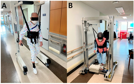 Andago (Hocoma AG, Volketswil, Switzerland) was used as the commercial over-ground walking assistance robot [18]. Andago, a ground-based gait-training system that combines a dynamic body weight support system with a mobile frame and automated tracking, is commonly used in the neurological rehabilitation of patients with gait impairments, such as recovering from stroke or spinal cord injuries (Figure 2A). Andago provides partial body weight support through a motorized harness and allows for natural vertical movement during ambulation, encouraging gait patterns closely resembling over-ground walking. The system is equipped with sensors that detect the user’s movement in real-time, enabling the device to automatically follow the user’s travel direction. This design allows users to walk freely without the restrictions of exoskeletal robotics while receiving fall prevention and body weight support. Unlike treadmill-based systems, Andago allows unrestrained movement across indoor spaces, offering a more realistic walking environment to enhance clinical rehabilitation outcomes.