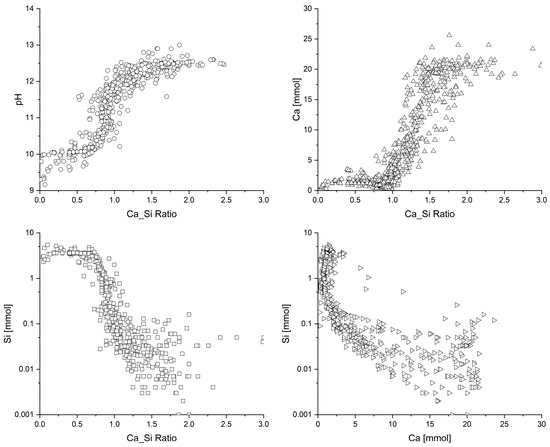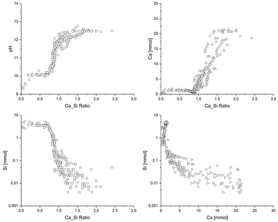Hidalgo et al. [2] provided a summary of the influence of C-S-H and portlandite on the chemical properties of the liquid phase in a hydrating cement. The high initial pH (>13) created from the dissolution of sodium and potassium hydroxides from the cement was lowered to approximately 12.5 because of the dissolution of other constituent minerals, including portlandite and C-S-H. They reported that previous research [11,12] measured the ongoing decalcification of C-S-H pastes due to leaching until a constant value of the Ca/Si ratio was reached.