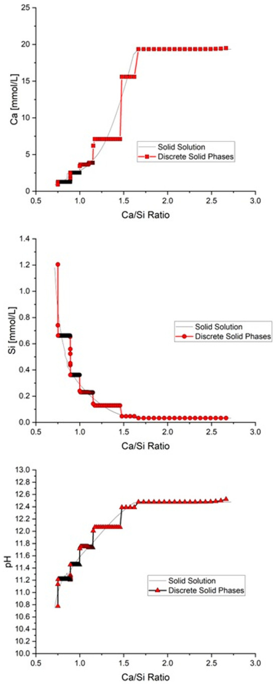 For the cement example shown in this paper, the portlandite was completely depleted after 280 days or 20 cycles. C-S-H was still present but will be depleted by approximately 5000 days (~360 cycles). The depletion of ettringite after c. 2000 days (~142 cycles) will cause a further reduction in Ca in the solution. It should be noted, however, that secondary phases, such as zeolites or amorphous silica, may precipitate under certain conditions that can modify silica availability in ways that may not be fully accounted for in equilibrium-based models. These uncertainties suggest that while thermodynamic models provide valuable insights, experimental measurement and validation remain crucial for refining predictions.