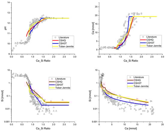 Walker et al. [18] reported that there are over 45 published C-S-H gel solubility models with Ca/Si ratios (mol/mol) of greater than 0.8. These, however, do not include those C-S-H solid solutions developed for the cemdata18 [15] database, namely, tobermorite–jennite, CSH3T, and CSHQ. These C-S-H solid solutions were employed here to predict the expected changes in pH, Ca, and Si against changing Ca/Si ratios using the PHREEQC geochemical code. The measured data from 777 C-S-H gel equilibrated solutions for pH, Ca (mmol/L), and Si (mmol/L), taken from Walker et al. [18], are shown in Figure 1. Using the selection criteria used by Walker et al. [18], namely, a curing temperature range of 17–30 °C and a curing time of ≥1 week, the final Ca/Si ratio of the C-S-H was measured, calculated, or calculable, the liquid phase was fully characterised, and the data were real. The solubility data in Figure 2 were used to compare the predicted pH, Ca, and Si against the C-S-H Ca/Si ratio. These data were deemed to be representative of C-S-H gel near equilibrium near room temperature (17–30 °C), with a curing time of one week or more.