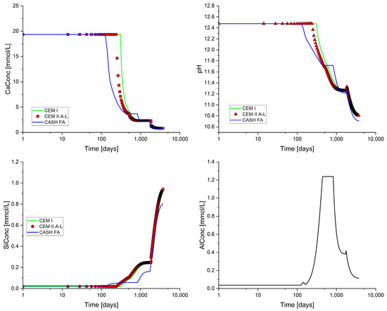 The SOLID_SOLUTIONS data block for the CEM II/A-L cement was identical to that shown in Table 5, whereas for the CEM I + 35% fly-ash model, the input shown in Table 10 was employed to account for the C-A-S-H gel model. The predicted changes in the Ca, Si, and Al concentrations and pH over time are shown in Figure 6. While there were minimal differences between the predictions for the CEM I and CEM II/A-L cements, the blended cement was somewhat different. This was due to the sequential leaching and eventual depletion of the hydrate minerals from the blended cements.