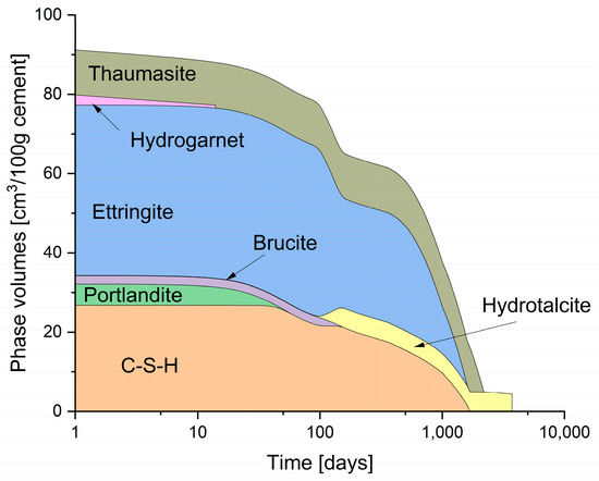 The change in the hydrate phases over time with ongoing exposure to 25 g/L of Na2SO4 is shown in Figure 7. The depletion of C-S-H and portlandite was much faster with the precipitation of thaumasite and higher volumes of ettringite than would be expected in pure water. These predictions are similar to the work of [42,43] and in terms of thaumasite precipitation, the lowering of the pH, and the expansion due to sulphate exposure, respectively. Previous work [44,45] has shown that the maximum rate of thaumasite formation is between 5 and 10 °C, but is stable above this range.