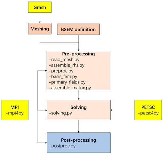 The code is primarily written in Python 3, relying on the scientific Python (v3.8) software stack for parallel computing through mpi4py [46] and petsc4py [47]. Additional scientific Python packages utilized include NumPy for efficient array operations and SciPy for numerical computations. Furthermore, the algorithm leverages the PETSc library [48] and its extensive data structures and parallel iterative solvers, accessible in Python via petsc4py and mpi4py.
