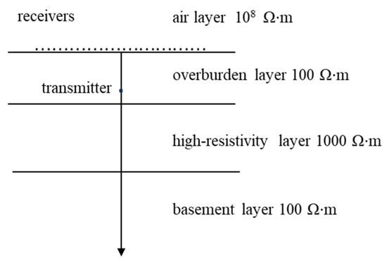Here, and represent the primary and secondary fields, respectively, and denotes the background resistivity. For layered models, minor effects are generally neglected in favor of considering only the dominant response . The primary field, Ep, can be obtained via a semi-analytical solution using Hankel transform filtering [45]. Therefore, we only need to make solutions for the secondary field, which is governed by the following equation: