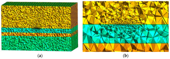 Figure 4 shows the unstructured mesh generated using a mesh refinement strategy. The spatial dimensions of the layered model are [−8000, 8000] × [−8000, 8000] × [−5000, 5000]. Figure 4a presents the meshing results generated by Gmsh, where the mesh consists of 334,489 elements, 681,379 faces, and 406,888 edges, with a total of 2,176,534 degrees of freedom.