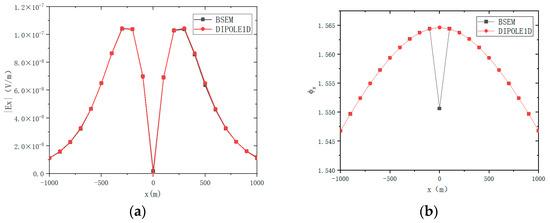 As shown in Figure 3, a four-layer one-dimensional stratified reservoir model was established, consisting of an air layer with a resistivity of 108 Ω·m, an overburden layer with a thickness of 1000 m and a resistivity of 100 Ω·m, a high-resistivity reservoir layer with a thickness of 800 m and a resistivity of 1000 Ω·m, and a basement layer with a resistivity of 100 Ω·m. The model was simulated using both the 3D edge-based finite element method with anisotropic resistivity and the semi-analytical solution software DIPOLE1D. A vertical electric dipole transmitter was positioned at a depth of 500 m with transmitter coordinates at (0, 0, −500). The receiver array was deployed along the x-direction, spanning from −1000 m to 1000 m, with a receiver station placed every 100 m, resulting in a total of 21 stations. Given that the typical observation frequency range for borehole-to-surface electromagnetic surveys is 0.1 Hz to 1000 Hz, this study adopts a frequency of 2 Hz for simulations.