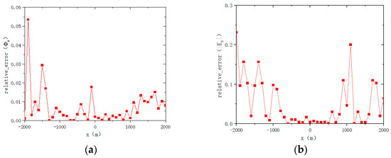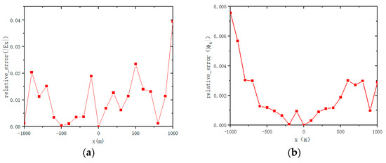 In this study, simulations were carried out using both Key’s 2.5-dimensional adaptive finite element method for controlled-transmitter electromagnetic modeling with anisotropy (MARE2DEM) and the borehole-to-surface electromagnetic method based on the unstructured-mesh 3D edge-based finite element anisotropic algorithm (BSEM) proposed in this paper. The response curves obtained from both methods were compared. As shown in Figure 10, the numerical simulation results from our algorithm are in excellent agreement with those from MARE2DEM. Figure 10a displays the amplitude (||) of the electrical response along the receiver line, clearly demonstrating that the responses from the proposed method and MARE2DEM are nearly identical; Figure 10b shows the corresponding phase comparison, with similarly high consistency. Furthermore, the relative errors in amplitude (||) and phase () were calculated, as illustrated in Figure 11. The absolute values of the relative errors for the magnitude and phase of the Ex component are less than 5% and 1%, respectively, confirming the reliability of the unstructured-mesh 3D edge-based finite element algorithm under anisotropic conditions.