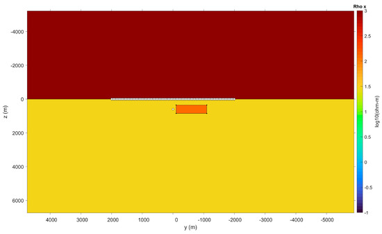 By substituting the resistivity values from the anisotropic model, the resistivity of the first rock layer is 21.61 Ω·m with a thickness of 400 m, the resistivity of the second rock layer is set to 90.37 Ω·m with a thickness of 1400 m, and the resistivity of the third rock layer is 21.61 Ω·m. The resistivity of the unexploited reservoir is set to 887.41 Ω·m, while the resistivity of the exploited reservoir is set to 451.85 Ω·m. The transmitter is placed at the center of the lower reservoir boundary at coordinates (0, 0, −1200) m, with an emission frequency of 1 Hz.