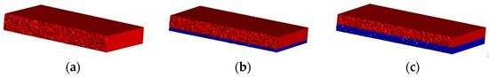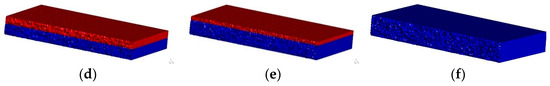 Schematic of the 3D reservoir model (red indicates unexploited reservoir layers, blue indicates exploited reservoir layers). (a) The recovery factor is 0%; (b) the recovery factor is 20% extraction; (c) the recovery factor is 40%; (d) the recovery factor is 60%; (e) the recovery factor is 80%; (f) the recovery factor is 100%.