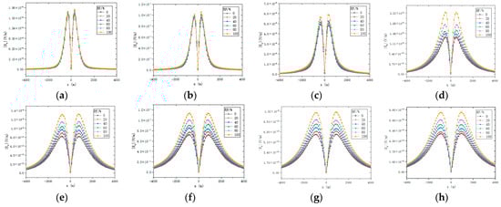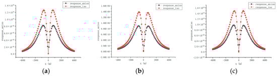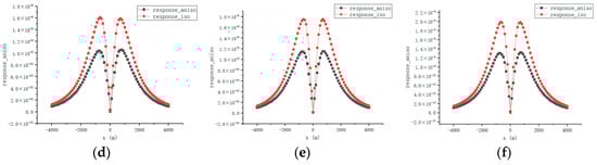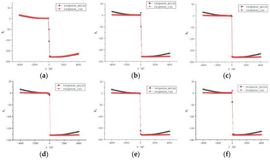 As shown in Figure 14a–f, when the measurement points extend along the profile from –4000 m to 4000 m, the amplitude gradually decays as the lateral distance |x| increases and reaches its minimum value at the center, exhibiting a typical bimodal distribution. Overall, the amplitude () of the isotropic model is higher than that of the anisotropic model at most measurement points. Additionally, as the reservoir recovery factor increases from 0% to 100%, the amplitude generally shows a progressive increase. A further comparison of the peak values of the curves for both models reveals that as the recovery factor increases, the peak value difference between the isotropic and anisotropic models gradually expands, indicating that the anisotropic effect on the amplitude response becomes more pronounced with an increasing recovery factor.