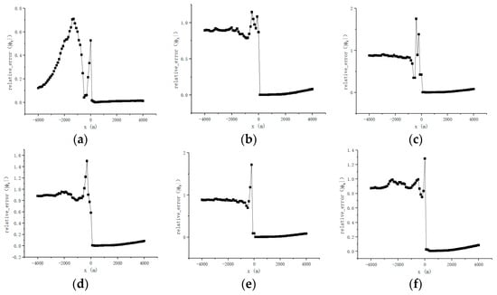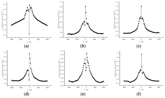 Combined with Figure 16a–f and Figure 17a–f, it can be observed that there are significant relative errors in the amplitude and phase values calculated from both the anisotropic and isotropic models, with the average relative error in some local regions approaching 100%. The calculation results show that the average error in amplitude is 42.49%, and the average error in phase is 41.54%. These simulation results indicate that when using the borehole electromagnetic method for reservoir monitoring, the anisotropic effects should be fully considered to improve the accuracy and reliability of the monitoring results.