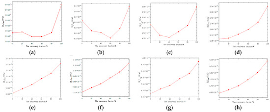 Corresponding curves of maximum amplitude f electromagnetic component and extraction rate at different transmission depths. (a) Transmitter at 500 m depth, (b) transmitter at 600 m depth, (c) transmitter at 700 m depth, (d) transmitter at 800 m depth, (e) transmitter at 1200 m depth, (f) transmitter at 1300 m depth, (g) transmitter at 1400 m depth, (h) transmitter at 1500 m depth.