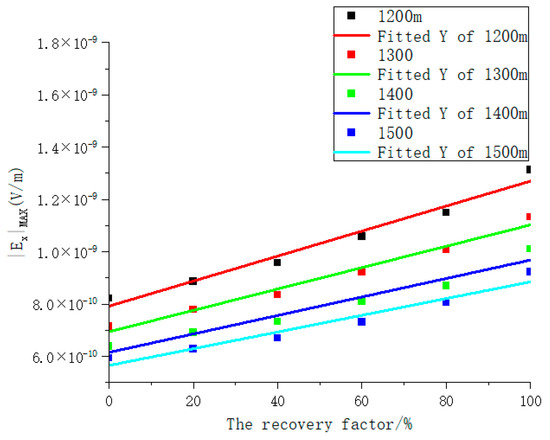 As shown in Figure 18a–d and Figure 19a–d, the maximum amplitude of the electromagnetic response exhibits a positive correlation as the source moves closer to the reservoir. However, when the source is positioned at depths of 500 m, 600 m, or 700 m, the electromagnetic signals received at the surface are minimally influenced by the reservoir, making effective dynamic monitoring infeasible. When the source is placed at the upper boundary of the reservoir, an analysis of the electromagnetic response under different extraction rates reveals that for extraction rates below 20%, the borehole-to-surface electromagnetic method fails to distinguish variations in reservoir depletion. However, once the extraction rate exceeds 20%, the electromagnetic response begins to show a positive correlation with the extraction rate. Furthermore, when the source is positioned below the reservoir, a linear fitting analysis of the maximum amplitude of different electromagnetic components at varying depths (see Figure 20 and Table 1) indicates that as the transmitter moves closer to the lower boundary of the reservoir, the slope of the fitting curve increases, suggesting a more pronounced sensitivity of the electromagnetic response to reservoir dynamic monitoring.