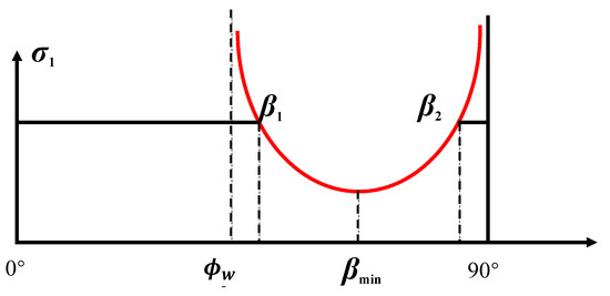 According to the single weak plane criterion, the trend of rock strength concerning the angle β is illustrated in Figure 1. Based on the physical significance and geometric features of the Mohr circle, it can be deduced that the upper and lower boundaries of the angles between the crack surface normal and the maximum principal stress correspond to the internal friction angle of the crack surface along which sliding failure occurs. When the angle β1 approaches infinity close to the internal friction angle of the bedding plane or β2 approaches 90°, the crack surface strength tends toward infinity.
