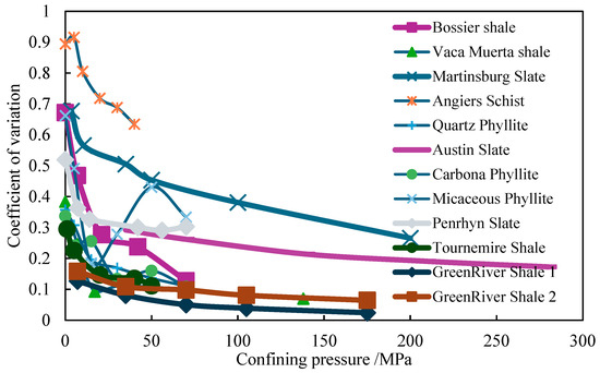 For relatively homogeneous lithological formations subjected to comparable confining pressure conditions, minimal strength disparity would be anticipated across different orientations. In contrast, transversely isotropic rocks demonstrate significant directional dependency, manifesting either U-curve or inverted V-shaped strength evolution patterns relative to bedding plane inclinations under equivalent confinement. This study’s evaluation framework for twelve sets of peak strength predictions through anisotropic criteria necessitates preliminary quantification of lithological anisotropy. The coefficient of variation emerges as an effective statistical measure for characterizing material heterogeneity, particularly suitable for cross-comparisons between diverse lithotypes under varying confinement states. This dimensionless metric, derived from the ratio of the standard deviation to the arithmetic mean, enables standardized assessment of mechanical property fluctuations across measurement scales and unit systems, thereby facilitating analysis of stress-dependent anisotropic responses in stratified geological media.