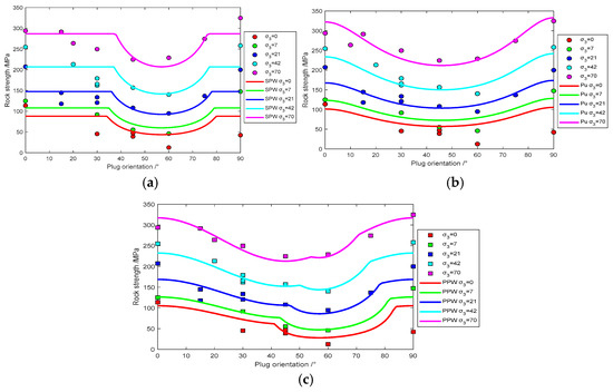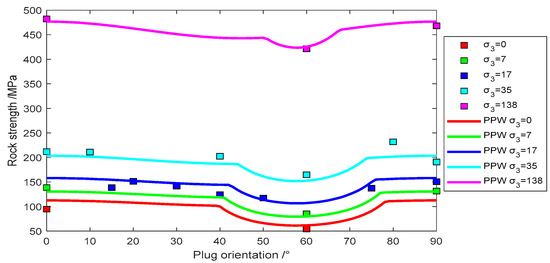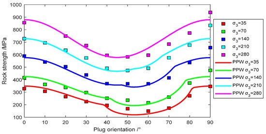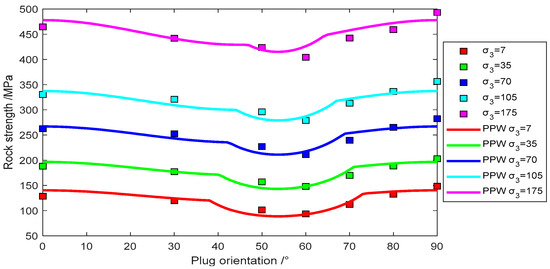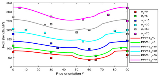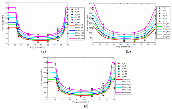 Analyzing the characteristics of the Pariseau criterion predictive curves as shown in Figure 3b and Figure 4b, it is noted that Pariseau’s model comprises a single expression encompassing all stress ranges, depicting a smooth transition in strength from shear fracture, mixed failure mode to sliding along weak planes. This criterion is a continuous function of the bedding plane angle (β). Another aspect of Pariseau’s model is its capability to capture strength differences between β = 0° and β = 90°, unlike the JPW model, which assumes the same strength at these angles, leading to a more accurate predictive performance.