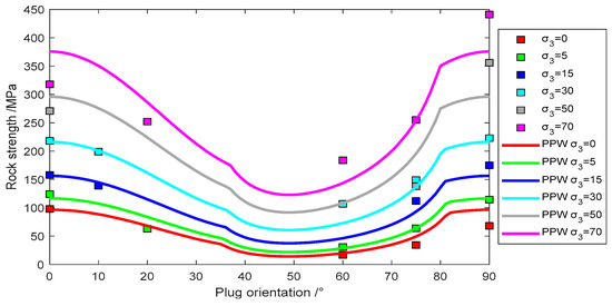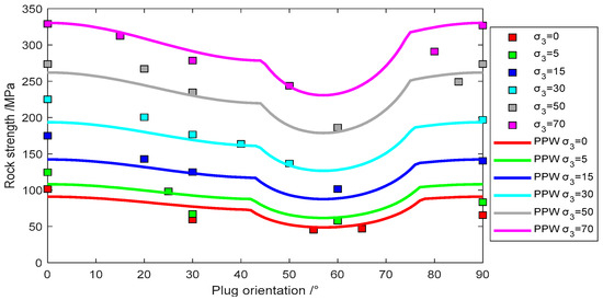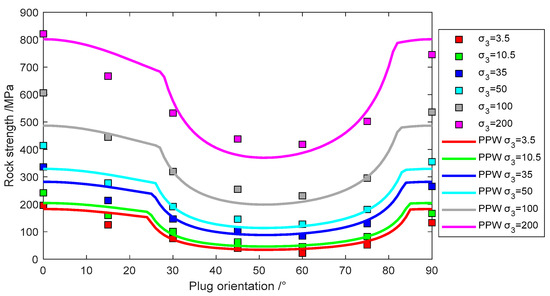 The plane of patchy weakness model [28,31,32,33] extended the conception of Jaeger’s plane of weakness, considering that the planes of weakness are heterogenous and contain some weak patches along the bedding orientation. Those patches are so weak that they fail at a lower loading force, which causes higher local stress and, consequently, global failure at lower external stress. The model for intrinsic rock strength and the plane of weak patchy failure is expressed in Equations (3) and (4):