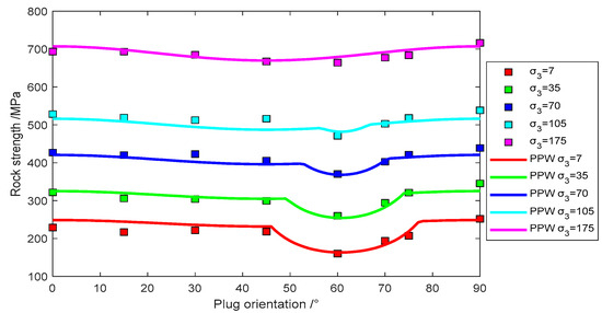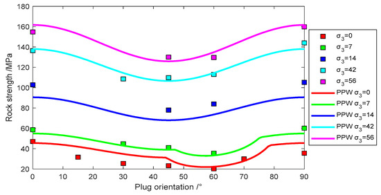 This suggests that the PPW criterion, by introducing the dimensionless parameter η in the SPW criterion, brings the strength predictive results closer to the tested values within the range of 0° to β1 and β2 to 90° of bedding plane angles. Moreover, it accommodates variations in strength anisotropy under different types of rocks and different confining pressures. However, unlike the Pariseau criterion predictive results, the limitation of the PPW criterion lies in its inability to distinguish between the strength of rocks oriented perpendicular to the bedding plane and those parallel to it.