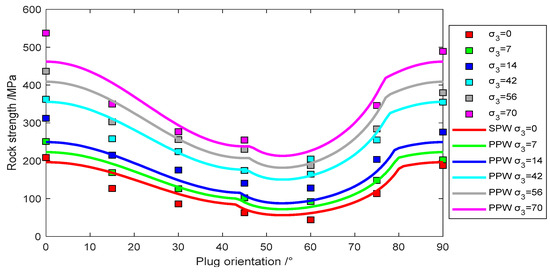 Using the fitting results from Table 1 to Table 3, the experimental data of Bossier shale and Angiers Schist, along with the predicted results of SPW, PPW, and Pariseau criteria, are simultaneously plotted in Figure 3 and Figure 4.