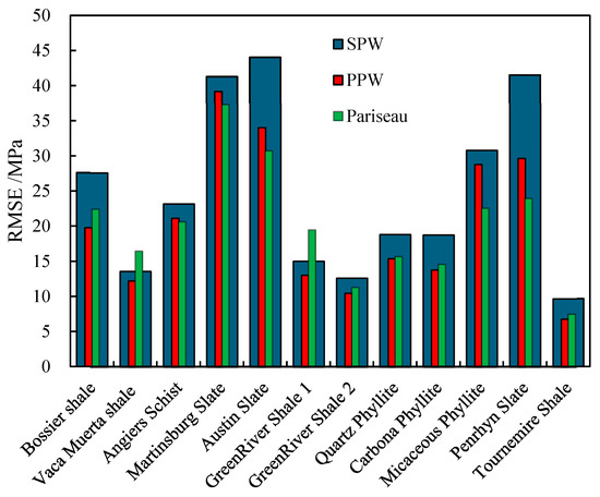 Comparison of RMSE predicated using SPW, PPW, and Pariseau criteria for various anisotropic rocks.