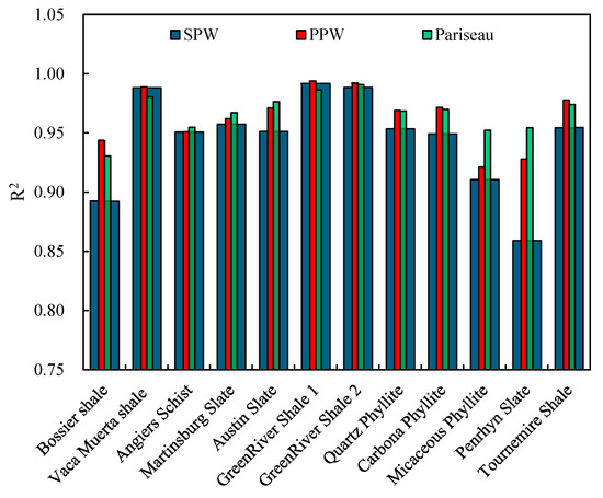 Assessing the predictive accuracy of different anisotropic strength criteria, the square of the correlation coefficient was used as an indicator, as shown in Figure 16. Analysis reveals that except for Bossier shale and Penrhyn Slate, the square of the correlation coefficient for strength prediction by SPW, PPW, and Pariseau criteria exceeds 0.9 for various rock types. This indicates the strong predictive capability of these three anisotropic strength criteria for the characteristics of layered rock strength. Statistically, the PPW criterion yields the highest R2 values for predicting the strength of seven different types of rock, while the Pariseau criterion achieves the highest R2 values for the remaining five types of layered rock strength prediction. Consequently, the PPW criterion demonstrates reasonably good predictive capabilities for anisotropic rock strength.