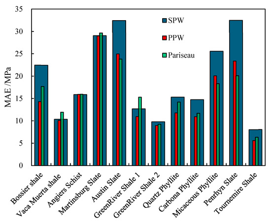 A complementary quantitative assessment through mean absolute error (MAE) evaluation, as visualized in Figure 17, reinforces the hierarchical performance pattern observed in RMSE analysis. The SPW criterion demonstrates statistically superior MAE magnitudes across eight lithological groups, corroborating its overestimation tendencies in strength predictions. In marked contrast, the PPW criterion achieves precision dominance with minimized MAE values for nine distinct stratified formations, whereas the Pariseau criterion shows optimal performance for three residual cases. This comparative analysis reveals a consistent predictive hierarchy: the PPW mechanism emerges as the most reliable predictor for anisotropic rock strength, closely trailed by the Pariseau formulation, while the SPW framework exhibits the weakest correlation with experimental measurements. The pronounced MAE disparities between these criteria quantitatively validate the necessity of incorporating multi-scale failure interactions in geomechanical modeling, particularly for complex layered systems where stress redistribution mechanisms operate across multiple bedding orientations.