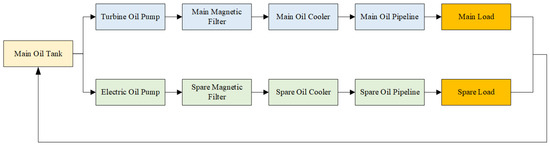In this study, the AMESim software was used to construct a simulation model of the lubricating oil system, which includes the flow process of the lubricating oil. Figure 2 below illustrates the flow path of the lubricating oil, detailing its movement through the system and the interactions between key components.