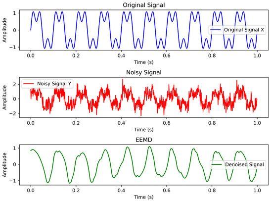 Figure 3(top) shows an idealized, noise-free original signal. The signal consists of the superposition of two sine waves with frequencies of 10 Hz and 30 Hz. Its waveform shows obvious periodicity and smoothness, which is representative of the “clean signal” in signal processing. The horizontal axis represents time (in seconds) and the vertical axis represents the amplitude of the signal. This plot is the reference point for all subsequent signal processing and reflects the real characteristics and frequency structure of the signal. In practical applications, bioelectrical signals and mechanical vibration signals often have similar characteristics but are often contaminated by the interference of the external environment or measurement errors.