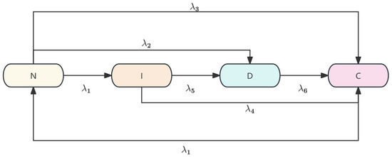 The lubrication system may randomly transition to the C state (severe failure state) from any state; the state transition rate is constant and follows an exponential distribution, which is used to model the system’s degradation process; the current degradation state can be observed through lubrication-related monitoring parameters, and it is assumed that the time of state detection can be ignored; and after scheduled maintenance, the system is restored to a near-new state, meaning that the I and D states can be repaired to the N state through scheduled maintenance, restoring lubrication functionality.