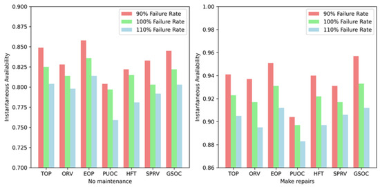 Since the input variables of the DBN are mainly calculated based on the failure rate and repair rate of the equipment, the sensitivity of each piece of equipment is obtained by setting the uncertainty of the failure rate of a single piece of equipment to 10%. The specific process is as follows: keep the failure rate of other equipment unchanged, adjust the failure rate of a single device to 110% and 90% of the original failure rate, and obtain the instantaneous availability value of the system after the change in the failure rate of the device, as shown in Figure 11. With the increase in the equipment failure rate, the reliability of the system decreases. As the failure rate of equipment decreases, the reliability of the system increases. The order of the influence of the failure rate of each piece of equipment on the instantaneous availability of the system is EOP > TOP > GSOC > ORV > SPRV > HFT > PUOC, and the weakest equipment affecting the reliability of the system are the Main Pump, Heat Exchanger, and Priming Pump.