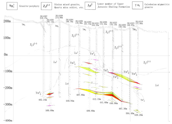 The mining area is located in Guixi City, Jiangxi Province. Through on-site investigation and a review of the feasibility study report, it is evident that the main geological units of the mining area include the quaternary loose layer, silver–lead–zinc ore body, crystal tuff, and granite porphyry. The geological conditions of the area are generally of medium type; Figure 1 is the geological profile of the mining area. Surrounding the Yinzhushan mining area are key buildings and structures such as Xiabao Village, Fengshuzui Village, Xiaoyuan Village, the Lengshui River, highways, the main shaft, and the return air shaft. In the Baojia mining area, the primary structures include the inclined shaft, high-level pool, Yinluling subsidence area, and filling station. The main structures in the Yinhai mining area consist of industrial sites, concentrators, and tailings ponds.