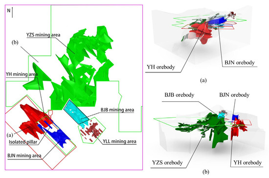 Since the mine obtained the mining license for the Yinzhushan mining area from the Jiangxi Provincial Department of Land and Resources in 1999, it has undergone more than 20 years of mining activities, including acquisitions and changes in mining rights. This has resulted in differing mining rights along the height direction of the mining area, meaning that the upper and lower parts of the mine are owned by different mining enterprises, as shown in Figure 2a,b represent two views in different directions. This situation has created significant challenges in determining whether the mine should be filled and what the appropriate filling rate should be during the mining process. Therefore, it is essential to simulate the mining, filling, and surface stability processes in this area.