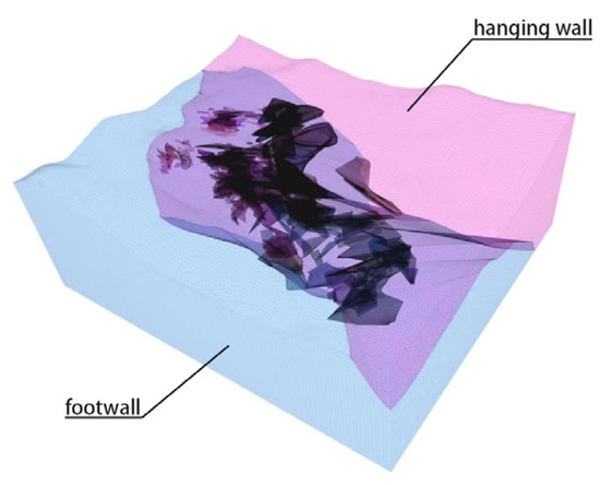 To reasonably simulate the surface deformation characteristics during mining and their impact on surface stability, the study thoroughly analyzed geological data and the range of the surface displacement belt. The spatial distribution of each stratum and its positional relationship with the ore body were comprehensively considered. The model assumes that the rock and ore bodies are quasi-homogeneous blocks/sections, thus conveying that they occupy approximately the same area and can be defined with the same parameters. The surrounding rock is simplified into granite porphyry (hanging wall) and crystal tuff (footwall), while the ore body consists of silver–lead–zinc ore. Using Rhino software, a mine model was established, covering three mining areas with an east–west length of 2500 m, a north–south width of 3000 m, and a vertical height ranging from −610 m elevation to the surface. To simulate a more realistic mining scheme, the model includes the adjacent BJ and YH mining areas. To reduce the number of grids, the ore body grid size was set to 5 m, and the surrounding rock grid size was set to 25 m. Figure 4 shows the ore body model, with a total of 9,105,363 nodes and 55,090,665 elements.