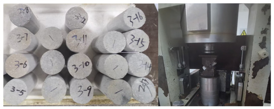 Based on the geological data provided by the mine, the hanging wall surrounding rock of the ore body is granite porphyry, and the footwall is crystal tuff. The mechanical parameters of the rock in the numerical simulation come from the measurement of the mine drilling core. The core obtained is shown in Figure 5. All types of rock exhibit high strength. Therefore, the mechanical parameters of three types of rock were determined through laboratory tests: granite porphyry, crystal tuff, and porphyry ore body. For each type of rock, uniaxial compression, shear, and tensile tests were conducted. To avoid randomness, each test was repeated four times. The mine uses cemented backfill, and the backfill parameters were provided by the mine. The measured parameters were then reduced using the GSI method to better align with actual mining conditions. The reduced physical and mechanical parameters of the rock and backfill are listed in Table 2.