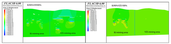 A total of 52 monitoring points were set up in this simulation, including villages, rivers, highways, and mine industrial sites. Table 3 shows the settlement heights of the monitoring points under the two schemes. Comparing the two schemes, it was found that increasing the backfill ratio in the YZS mining area could reduce subsidence at most monitoring points. Under Scheme 1 in Table 3, 7 out of the 52 monitoring points experienced surface subsidence exceeding 30.00 mm, with the maximum subsidence of 53.98 mm occurring at YH6. Among the key monitoring points, BJ12, GC9, and YH17 exceeded the standard value of 30.00 mm, with subsidence values of 46.50 mm, 41.43 mm, and 33.72 mm, respectively. Under Scheme 2 in Table 3, 3 out of the 52 monitoring points experienced surface subsidence exceeding 30.00 mm, with the maximum subsidence of 51.93 mm occurring at YH6. Among the key monitoring points, BJ12 exceeded the standard value of 30.00 mm, with a maximum subsidence of 45.54 mm. Comparing the two filling schemes and improving the filling rate of YZS, the settlement of BJ12 is reduced by 0.96 mm, the settlement of GC9 is reduced by 39.58 mm, the settlement of YH5 is reduced by 2.5 mm, the settlement of YH6 is reduced by 2.05 mm, the settlement of YH8 is reduced by 1.68 mm, the settlement of YH17 is reduced by 32.94 mm, and the settlement of YH18 is reduced by 22.86 mm. Figure 7 shows the right diagonal cross-section of the model under the two scenarios. It can be observed that when the backfill ratio in the YZS mining area is 90%, a significant subsidence zone appears in the upper part of the mining area. However, after increasing the backfill ratio in the YZS mining area, the subsidence values in this zone significantly decreased. Nevertheless, small-scale roof collapses may occur within the BJ mining area, so additional measures are needed to mitigate potential roof collapses in this area. Figure 8 shows the surface subsidence contour maps under the two scenarios. By comparing Figure 8, it is evident that after increasing the backfill ratio in the YZS mining area, the subsidence center shifted, and the subsidence range was significantly reduced.