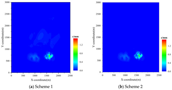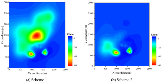 Figure 11 shows the lateral deformation contour maps under the two scenarios. Under both Figure 11a,b, Scheme 1 and Scheme 2, the lateral deformation values on the surface are very small. Under Figure 11a, Scheme 1, the maximum deformation value of 0.37 mm/m occurs at monitoring point CZ2 among the 52 monitoring points. Under Figure 11b, Scheme 2, the maximum deformation value of 0.35 mm/m occurs at monitoring point BJ12 among the 52 monitoring points. However, the lateral deformation values are far below the standard requirements. As shown in Figure 11, distinct deformation centers are observed under both scenarios. Increasing the backfill ratio in the YZS mining area slightly reduces the lateral deformation within the mining area, indicating that raising the backfill ratio in the YZS mining area decreases lateral deformation, but the effect is not significant.