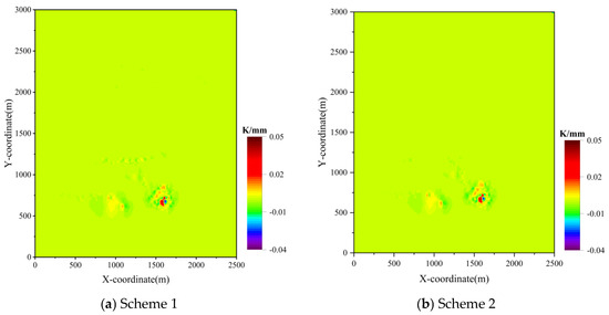 Figure 10 shows the surface curvature contour maps under the two scenarios. Under Figure 10a, Scheme 1, the surface curvature values are very small, with the maximum curvature of 0.012 mm/m2 occurring at monitoring point CZ2. Under Figure 10b, Scheme 2, the maximum curvature of 0.006 mm/m2 occurs at monitoring point YH19. An analysis of Figure 10 reveals that increasing the backfill ratio in the YZS mining area has almost no effect on surface curvature. According to the stability criteria, the curvature values under both scenarios are far below the critical deformation limit of 3 mm/m2, indicating that surface curvature has almost no impact on the ground under either scheme.