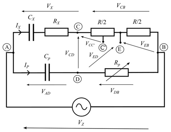 The bridge, which is the basis of synthesis, is shown in Figure 1. It is designed to measure the dielectric loss factor tan δ. The concept of this bridge was presented in ref. [12]. The principle of operation of the bridge is presented in an extremely concise way, making the analysis of the system somewhat difficult.
