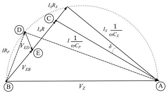 The vector of the voltage drop across the real component of the capacitor presented in Figure 8 has been significantly scaled for the readability of the drawing. In fact, it is much smaller. The modulus of the voltage across the capacitor CP can be approximated as equal to the voltage module VDD’’. Then, the error caused by the capacitor′s loss factor can be estimated as