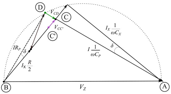 In the same way, the error related to the loss of the CP capacitor can be determined. In this case, the displacement of the D point will involve a change in the phase angle of the voltage across the lossy capacitor.