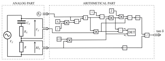 Figure 6 shows the structure of a non-bridge system for measuring the dielectric loss coefficient tan δ, derived from the equations describing the bridge in Figure 1. The non-bridge system consists of two parts. The analog part contains the power source, the ZX impedance under test, and the R resistor of a known value. The output signals of the analog part are the voltage VX across the impedance ZX and the voltage proportional to its current IX. The second part of the system is the arithmetic part, in which the detected voltages w1 and w2 are determined according to Equations (8) and (13), respectively. The modules or RMS values of the w1 and w2 signals are compared in the DET detector. In the equilibrium state, to which the system is driven by changing the RP parameter, the measured tan δ is determined by dividing the modules or the RMS values of the signals according to the relationship (13).