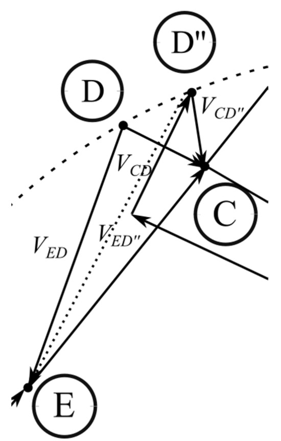 Other sources of error in the system in question are related to the incorrect position of the D point during measurement. This can be caused by an error in the detection of equilibrium and a loss of the CP capacitor. In the first case, the equilibrium state of the bridge means the equality of modules and thus the values of the effective voltages VEB and VED. The inequality of the mentioned voltages, caused by the incorrect detection of their equality, results in the adoption of an equilibrium state despite the inequality of the VEB and VED voltage modules. Then, on the phasor diagram, the point D′ is taken as the potential of point D, which results in a change in the value of the voltage VCD to the value of VCD′. Figure 7 shows an illustration of the loci of points D and D′ on the Gaussian plane. For readability, a fragment of the phasor chart is presented.