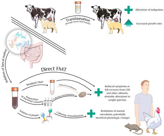 FMT is also the subject of research oriented towards improving the health, well-being, growth rate and final product quality of various animals. There exists a procedure called transfaunation, which has been common in animal husbandry for at least a few hundred years, that is based on transferring cud or rumen fluid from healthy animals to individuals suffering from indigestion [63]. While these substances are not faeces per se, the principle of transferring beneficial biological factors remains essentially the same. Available studies on transfaunation are surprisingly scarce given the long history of the procedure, but the current literature confirms its efficiency in treating indigestion caused by various factors [64]. Another study showed that transfaunation can significantly increase growth rates in lambs [65]; interestingly enough, this effect was observed after supplementation not only with sheep rumen fluid but with cow rumen fluid, suggesting an intrinsic potential of interspecific alimentary tract microbiota transfers that may also be applicable in the context of FMT.