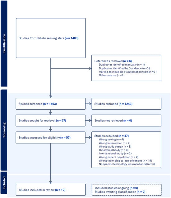The study selection process (Figure 1) was carried out using Covidence by three researchers based on predefined eligibility criteria. Initially, 1409 studies were identified from databases and registers. After removing six duplicate records (one manually and five via Covidence), 1403 studies proceeded to the screening stage. Following title and abstract screening, 1243 studies were excluded, leaving 57 studies for full-text assessment. All 57 studies were successfully retrieved, but 47 were excluded due to various reasons, including inappropriate setting (n = 4), intervention (n = 2), study design (n = 8), theoretical focus (n = 3), interventional study design (n = 2), wrong patient population (n = 4), incorrect technological specifications (n = 19), and absence of specific technology mention (n = 5). Consequently, 10 studies met the inclusion criteria and were included in this scoping review, with no ongoing or unclassified studies.