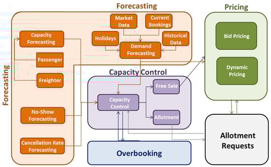 A review of the literature on revenue management reveals that the concept was initially applied to the airline industry but was subsequently adopted by other sectors. With the application of revenue management to air transportation, benefits such as increased profitability, better use of resources, meeting the needs of different types of customers, digitalization of systems, and increased customer satisfaction and loyalty are achieved. However, due to the significant differences between air cargo and passenger transportation, the application of revenue management practices in the former has been relatively limited in comparison to the latter. The analysis of revenue management in air cargo can be divided into four main categories: forecasting, capacity control, overbooking, and pricing. All of the aforementioned components are correlated and interact with one another. Figure 1 illustrates the interrelationship between the components of air cargo revenue management. When the figure is analyzed, it can be seen that the air cargo revenue management process starts with forecasting. In the context of forecasting, it is possible to estimate a number of variables, including demand, capacity, cancelation, and no-show rates. Forecasting data is a prerequisite for the capacity control phase. While forecasting demand, holidays, market data, existing bookings, and data from the past period can be used. In order to accurately forecast capacity, it is essential to evaluate cargo and passenger aircraft separately.