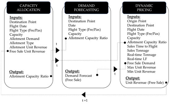 The solution to this optimization problem comprises three primary components: capacity allocation, demand forecasting, and dynamic pricing. In order to determine the model inputs, the existing literature was extensively reviewed, and expert opinions were sought through interviews with the employees of one of the leading air cargo companies in the sector. The interrelation of these three components is illustrated in Figure 2. The model commences with the capacity allocation component, which aims to allocate resources in an efficient manner. The model employed in this stage is derived from the capacity allocation model for the air cargo industry, as published in 2022 [7]. The capacity obtained in this stage serves as the input for both demand forecasting and dynamic pricing. In the subsequent stage, the output of the demand forecasting model serves as the input for pricing. The third stage of the problem resolution is the dynamic pricing of the capacity. The price obtained from the pricing model serves as the input for the capacity allocation section in subsequent periods. Consequently, the objective was to furnish dynamic price recommendations with an integrated structure and an iterative process.