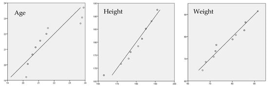 This study recruited 15 male college basketball players as participants, meeting the required sample size []. To ensure the representativeness of the sample, this study utilized the quantile–quantile plot (Q-Q Plot) for normality testing [], as shown in Figure 1. The results showed that the pre-test means and standard deviations of the participants’ background variables all exhibited a linear normal distribution, including age (21.4 ± 1.29 years), height (180 ± 8.70 cm), weight (78.2 ± 7.68 kg), body mass index (24.1 ± 1.78 kg/m2), skeletal muscle mass (37.9 ± 4.75 kg), and body fat mass (13.3 ± 3.79 kg). Additionally, all values fell within the 95% confidence interval (CI) range [].
