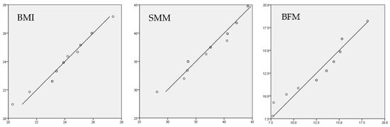 Normal distribution of participants’ background variables. Note: The horizontal axis represented “observed values”, while the vertical axis indicated “deviation from normality”. The abbreviation for body mass index was BMI; skeletal muscle mass was abbreviated as SMM, and body fat mass was abbreviated as BFM.