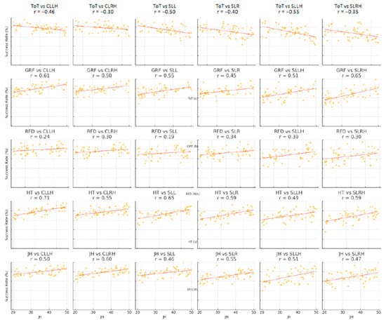 This section standardized the raw data into Z-scores for lower limb joint mobility (including hip joint, knee joint, and ankle joint), lower limb explosiveness (including jump time, ground reaction force, rate of force development, hang time, and jump height), and advanced layup success rates (including left-hand and right-hand crossover layups, left spin and right spin layups, and left-hand and right-hand straight-line layups). A Pearson correlation coefficient analysis was conducted to explore their relationships, with the results being presented in Figure 2. The analysis revealed that, except for jump time, which showed a low correlation with advanced layup success rates, all other parameters of lower limb joint mobility and lower limb explosiveness demonstrated a moderate to high positive correlation with advanced layup success rates. When performing a layup, the lower the angle of the lower limb joints, the higher the resulting rate of force development, thereby enhancing the success rate of advanced layup techniques. These results demonstrated that lower limb joint mobility and lower limb explosiveness significantly influenced the improvement of advanced layup success rates. However, their impact was not absolute and might be further modulated by other factors, such as technical stability and neuromuscular coordination. The findings of this study validated the significant correlations between lower limb joint mobility, lower limb explosiveness, and advanced layup success rates. Furthermore, the results provided empirical support for the application of plyometric training in improving the technical performance of basketball players.